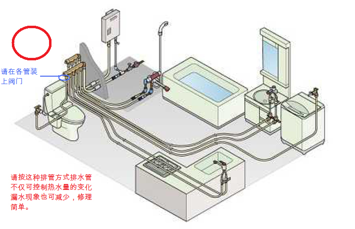 这种排管方式排水管不仅可以控制热水量的变化,漏水现象减少,修理也更简单
